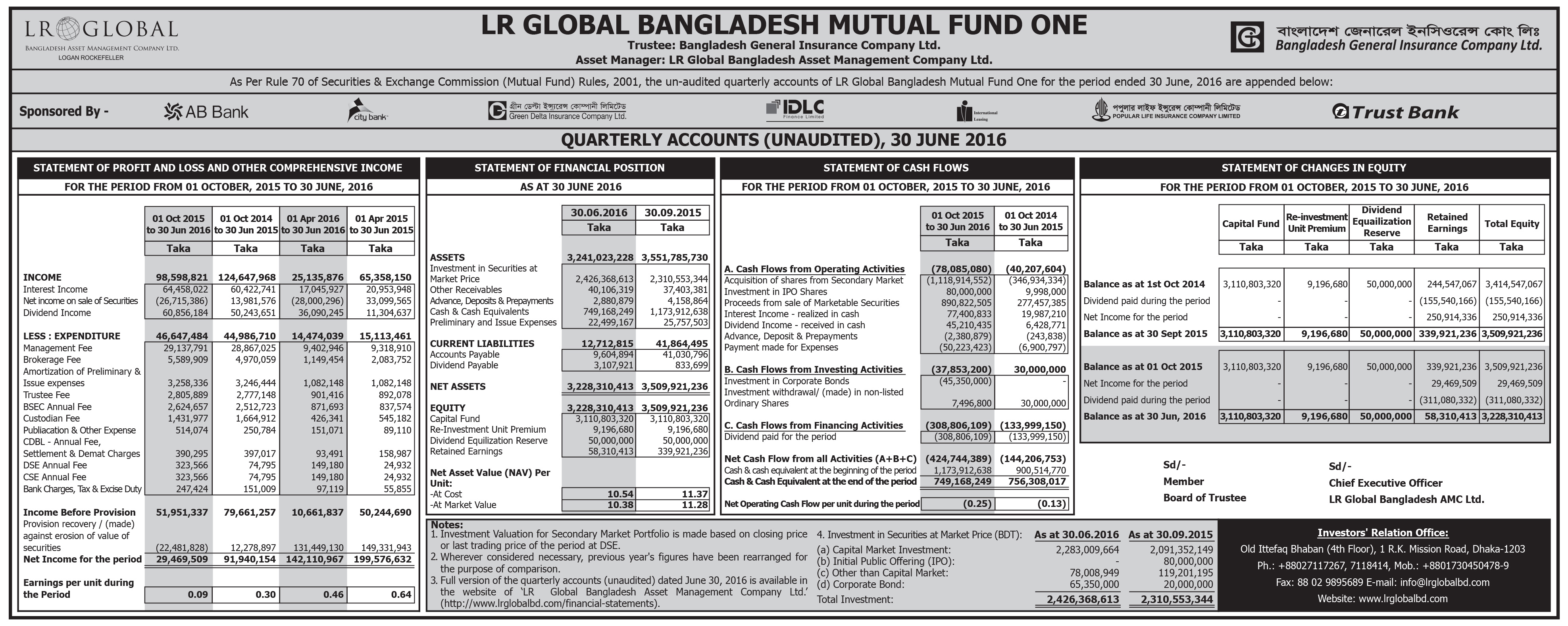 Quarterly Financial Statements (Un-audited) of LR Global Bangladesh Mutual Fund One