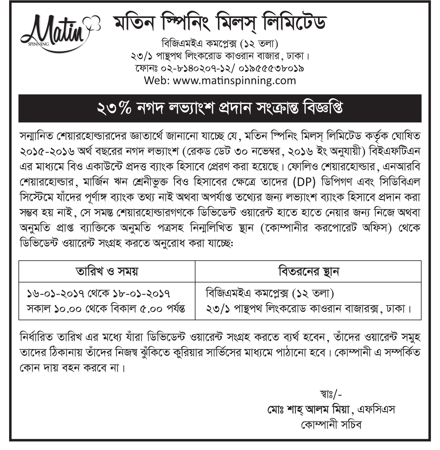 Matin Spinning Mills Ltd Dividend Distribution Notice 2017