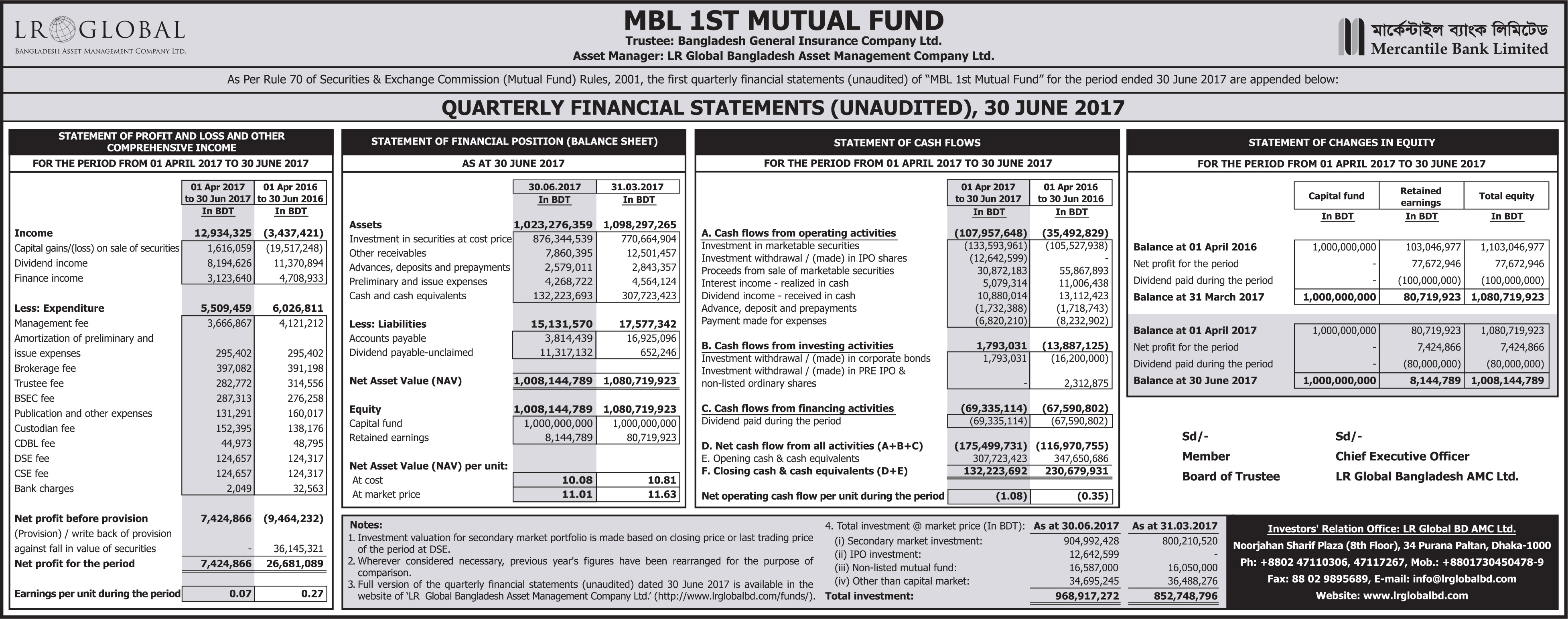 Half Yearly Financial Statements (Unaudited) of MBL 1st Mutual Fund