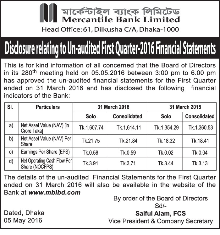Mercantile Bank Limited 1Q Un-audited Financial Statements