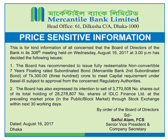 Mercantile Bank Limited Price Sensitive Information