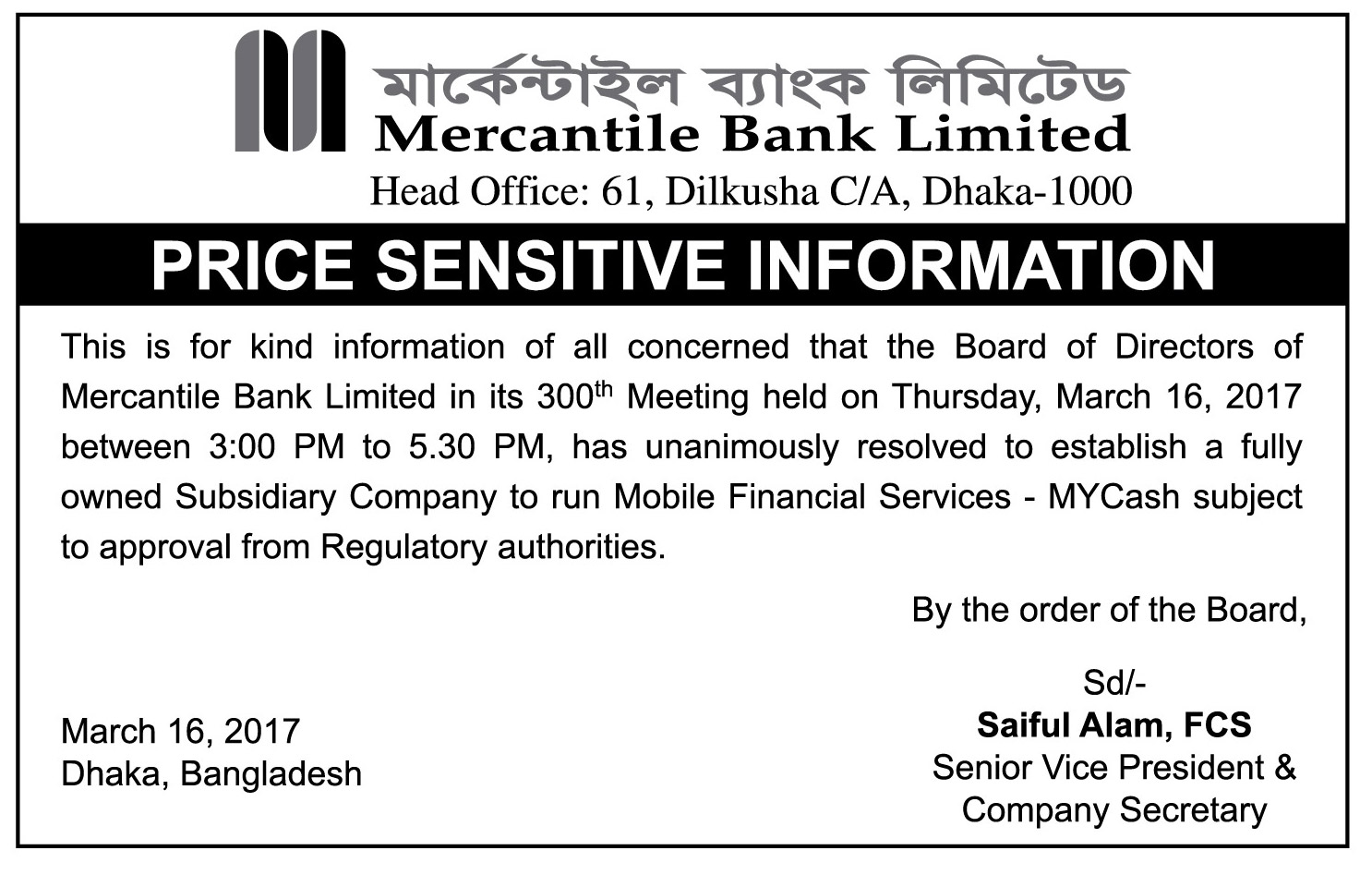 Declaration of Coupon Rate of Mercantile Bank Perpetual Bond