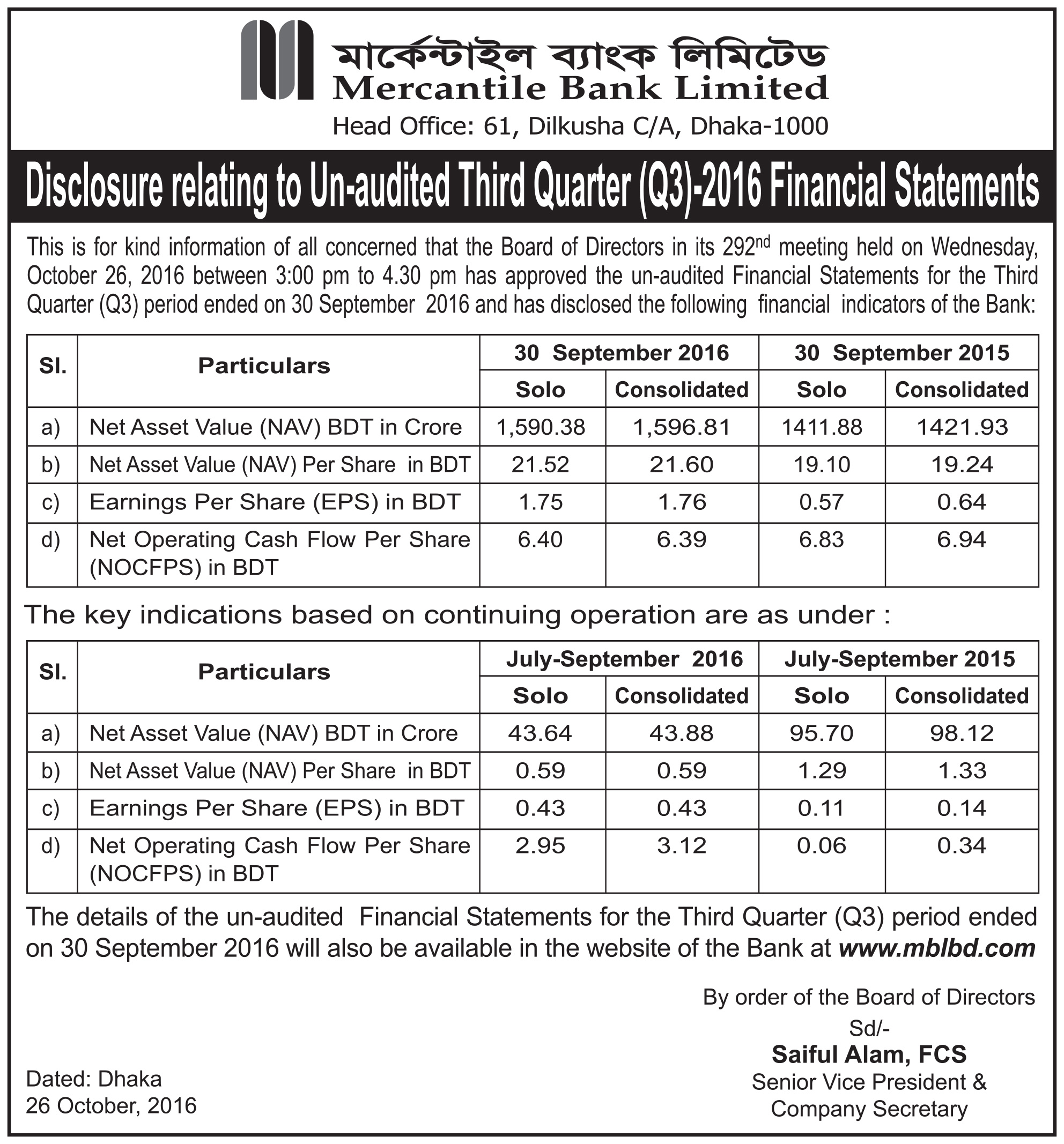 Q3 Un-audited Financial Statements of Mercantile Bank PLC.