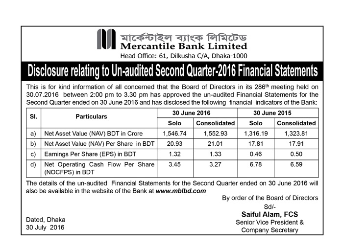 MERCANTILE BANK LTD DISCLOSURE RELATING TO UN-AUDITED SECOND QUARTER FINANCIAL STATEMENTS