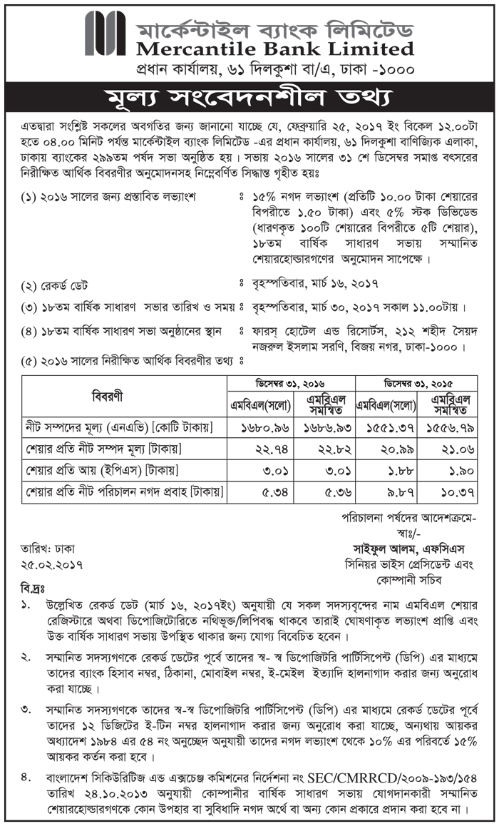 MERCANTILE BANK LTD Price Sensitive information February 2017
