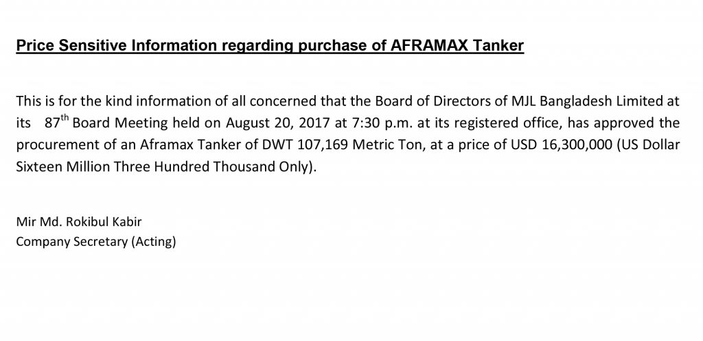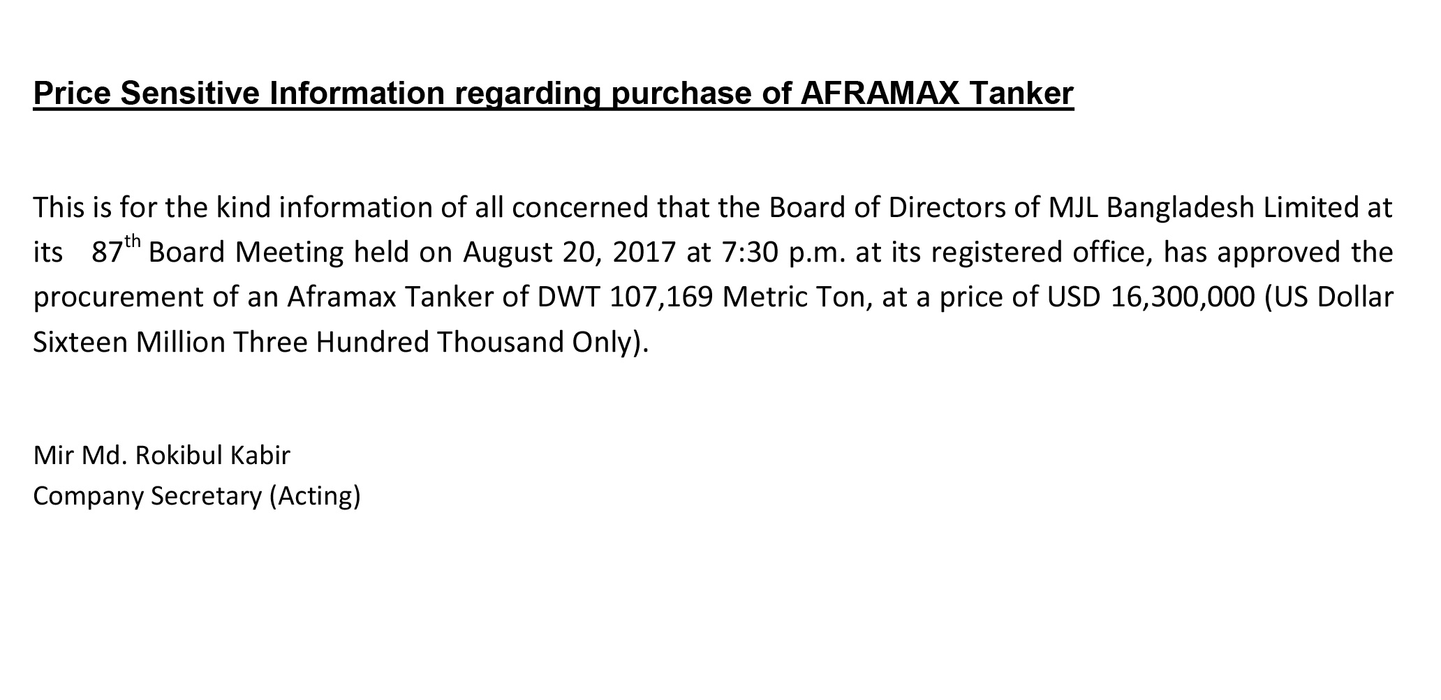 MJL Bangladesh Limited Price Sensitive Information regarding purchase of AFRAMAX Tanker