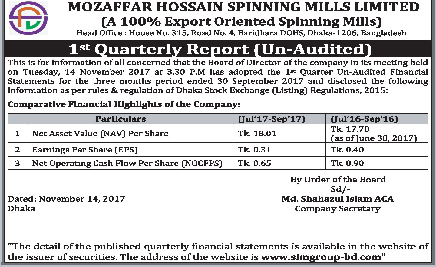 Mozaffar Hossain Spinning Mills Limited Q1 Report (un-adudited)
