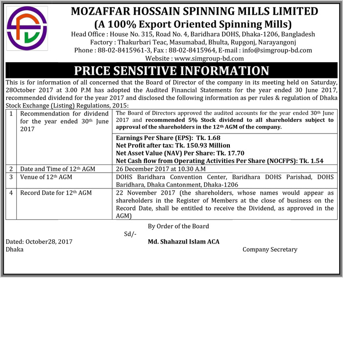 Mozaffar Hossain Spinning Mills Ltd Price Sensitive Information February 2017