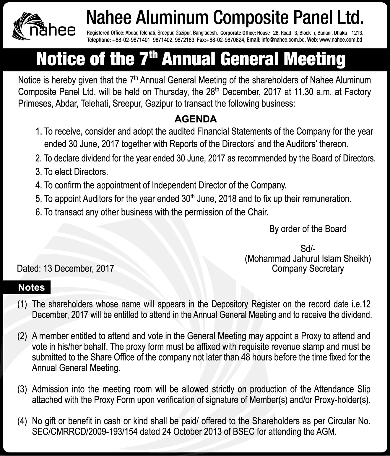 Nahee Aluminum Composite Panel Ltd 7th AGM Notice