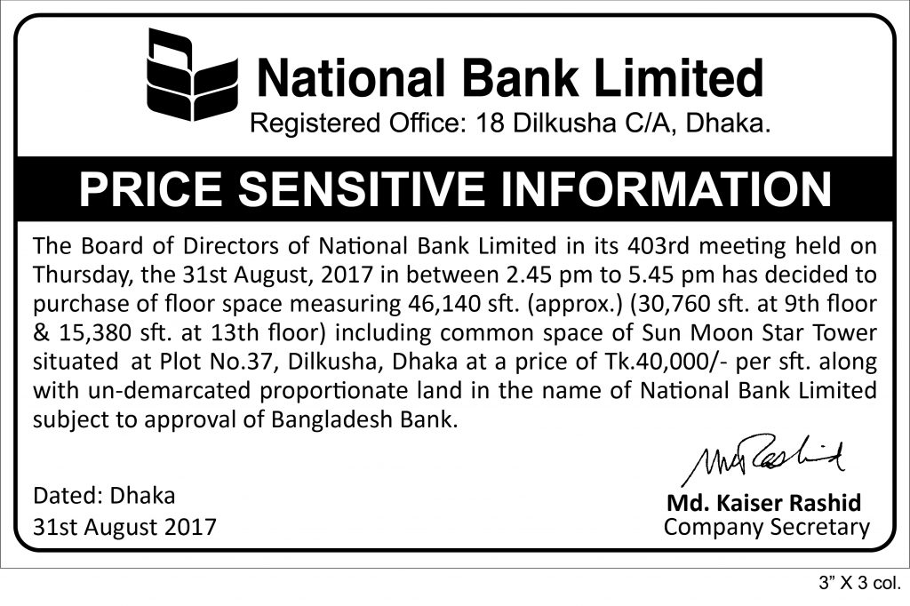 NATIONAL BANK LTD PRICE SENSITIVE INFORMATION