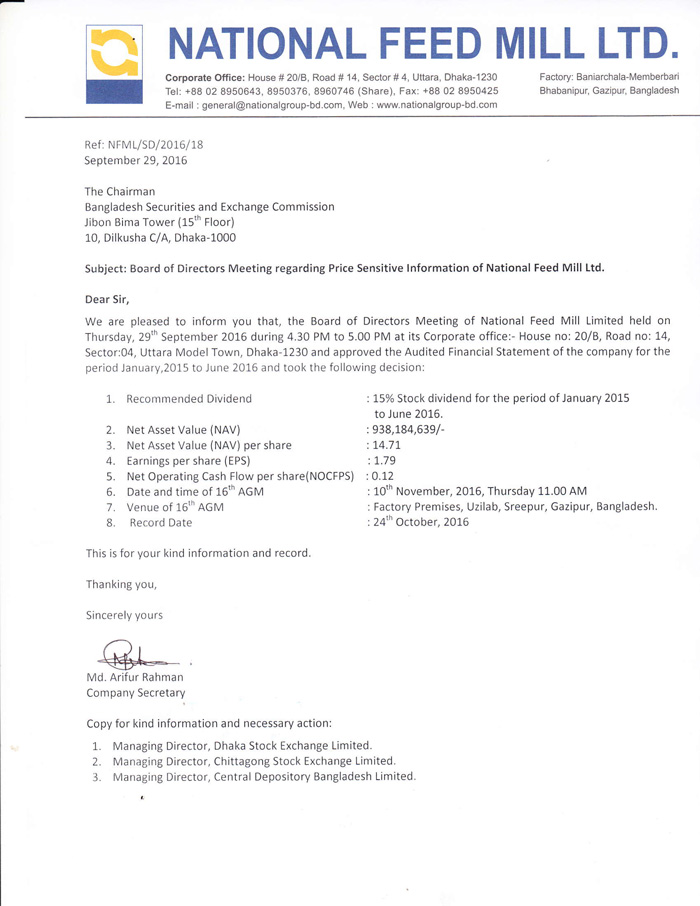 National Feed Mill Limited Price Sensitive Limited