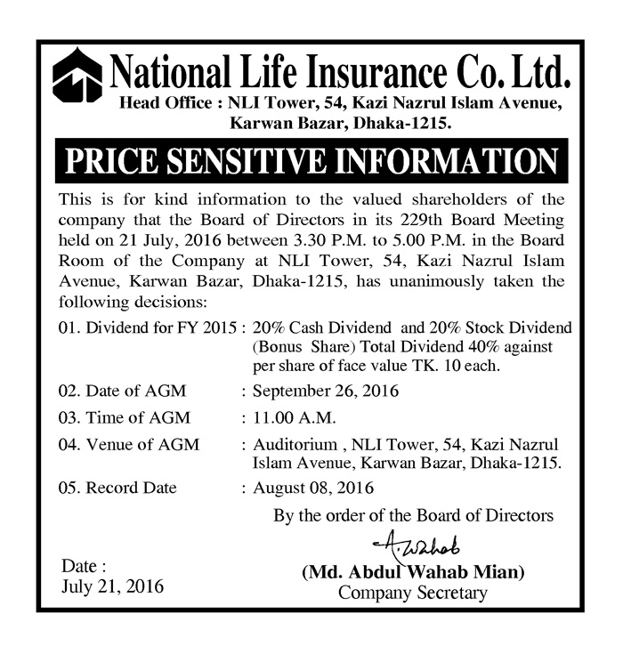 Price Sensitive Information of National Life Insurance Co. Ltd.