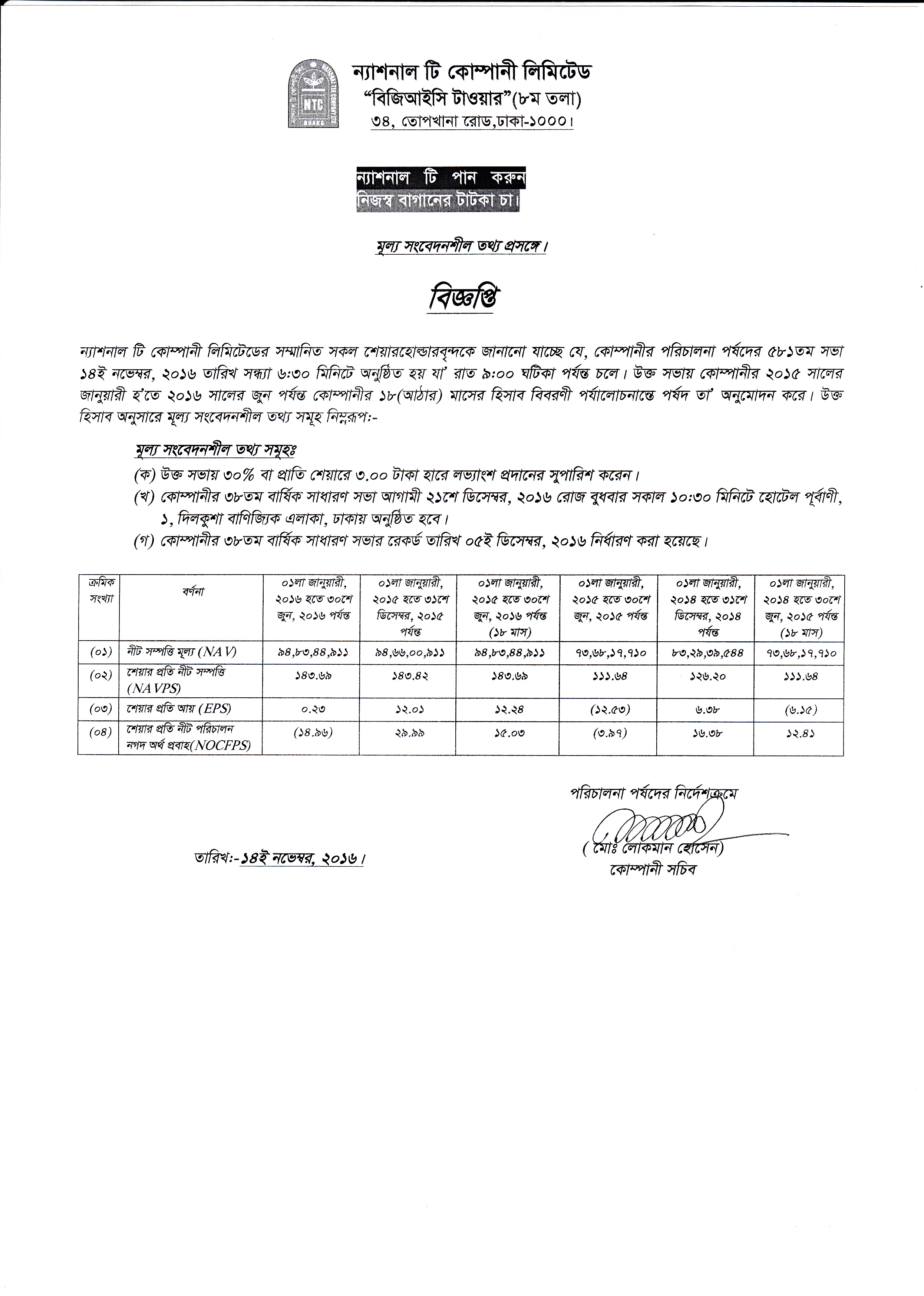 Price Sensitive Information of National Tea Company Ltd