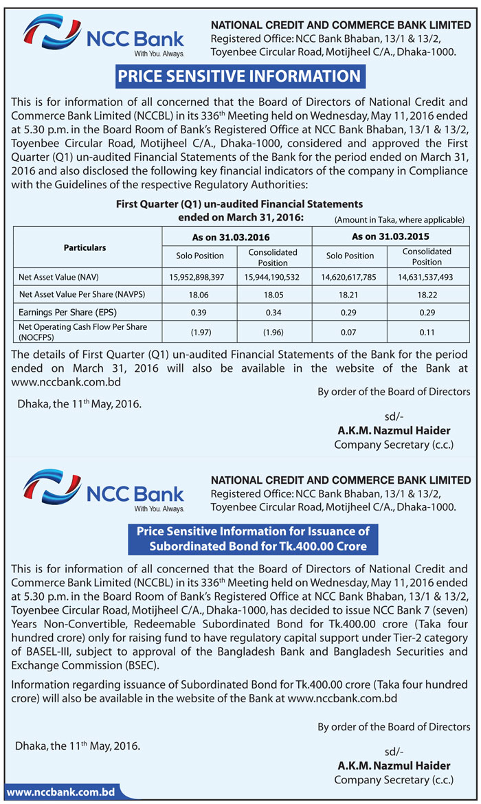 Price Sensitive Information Of NATIONAL CREDIT AND COMMERCE BANK LTD.