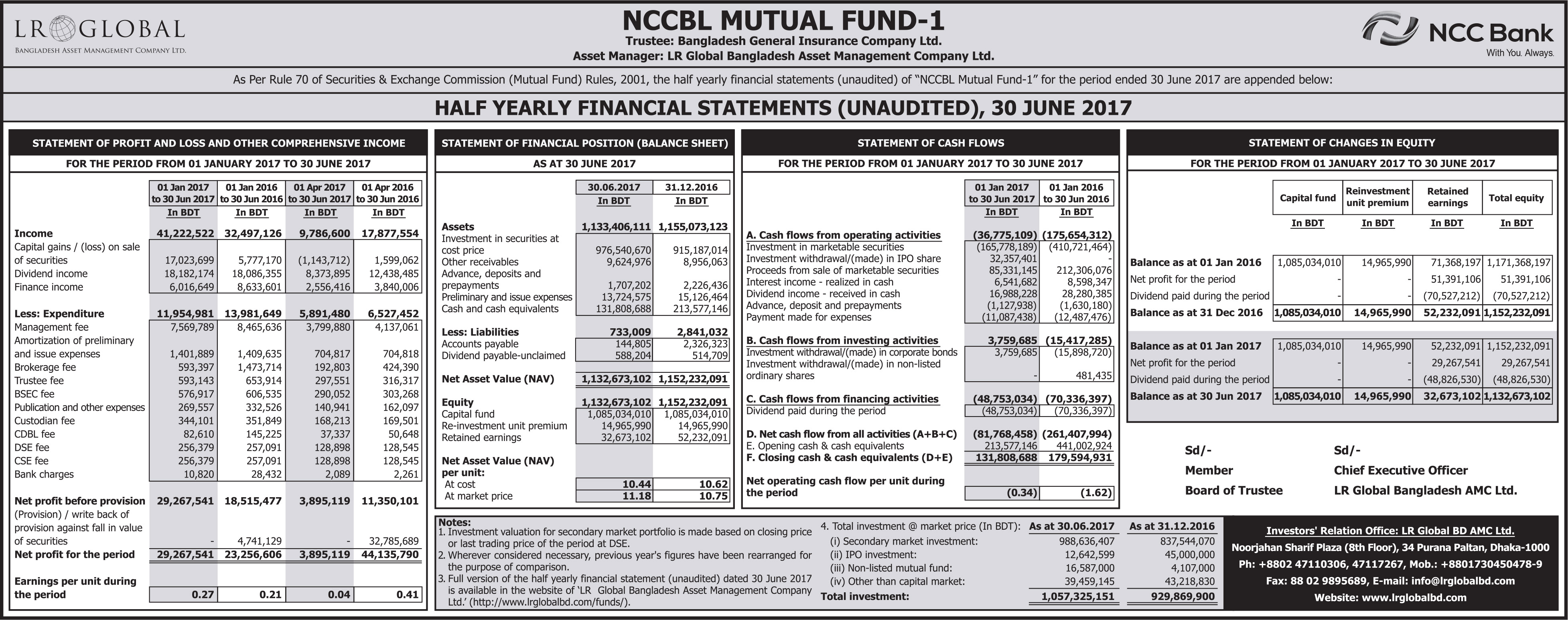 Half Yearly Financial Statements (Unaudited) of NCCBL Mutual Fund-1