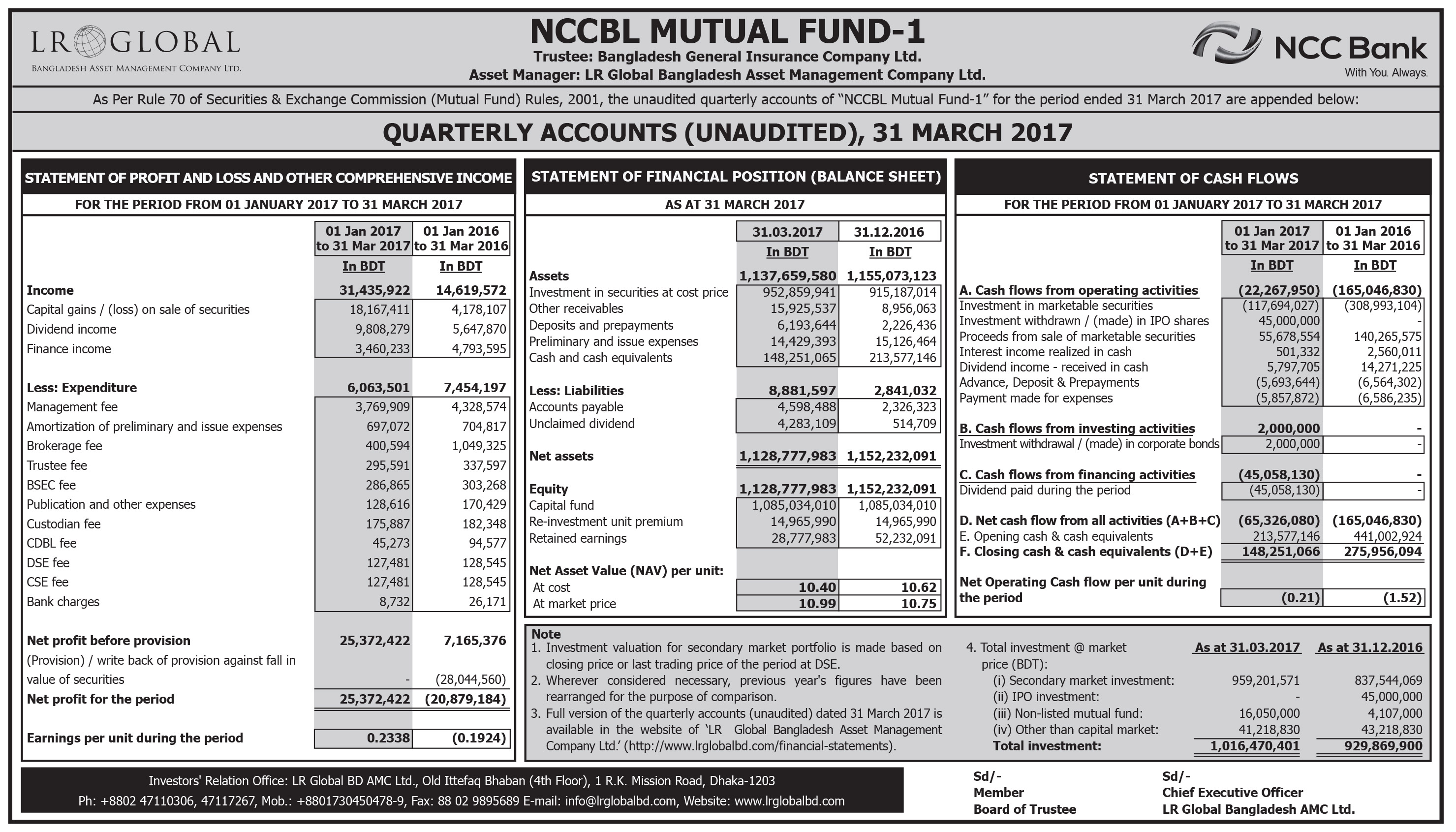 NCCBL Mutual Fund-1 Quarterly Accounts, 31 March 2017