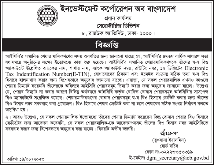Notice of Investment Corporation of Bangladesh (ICB)