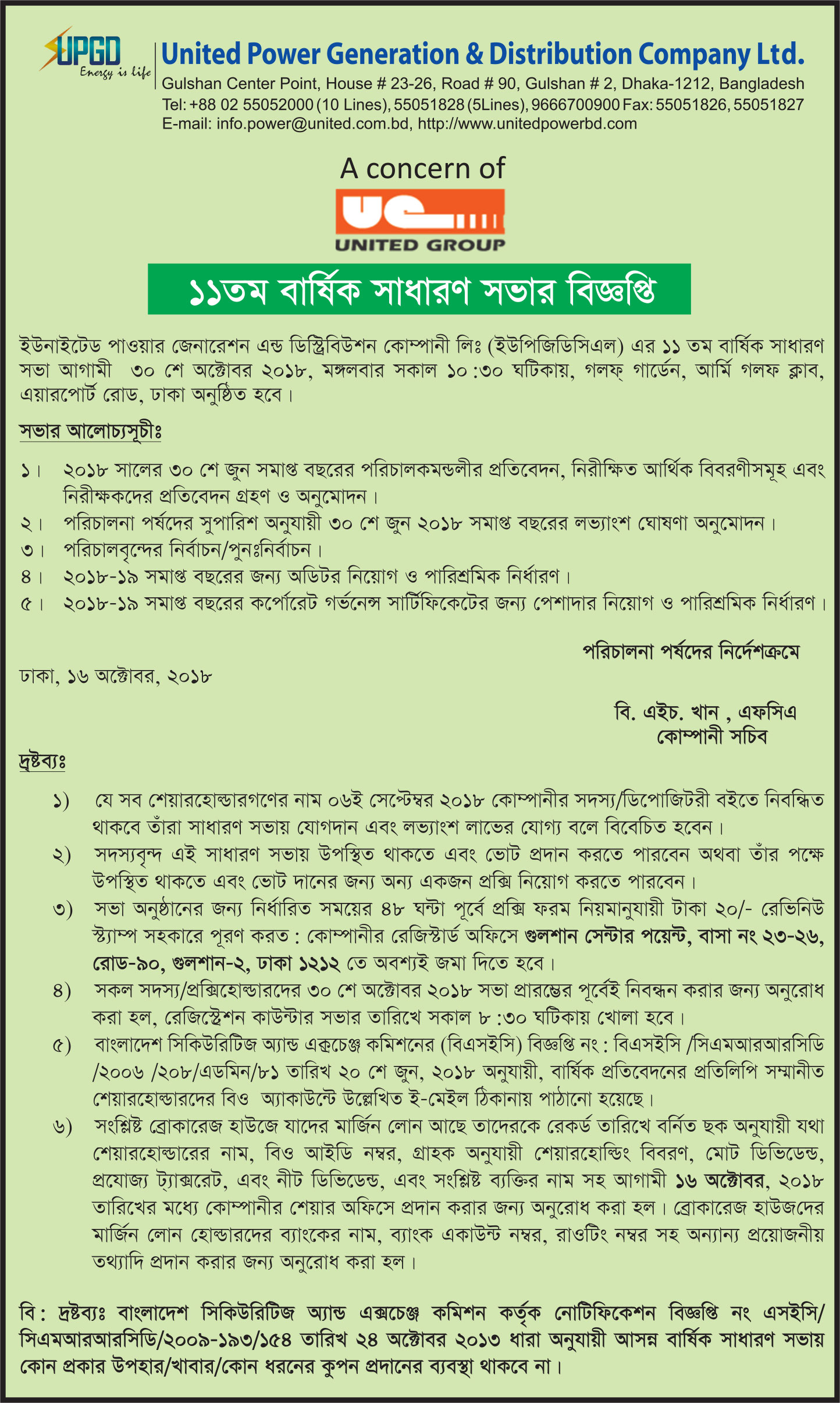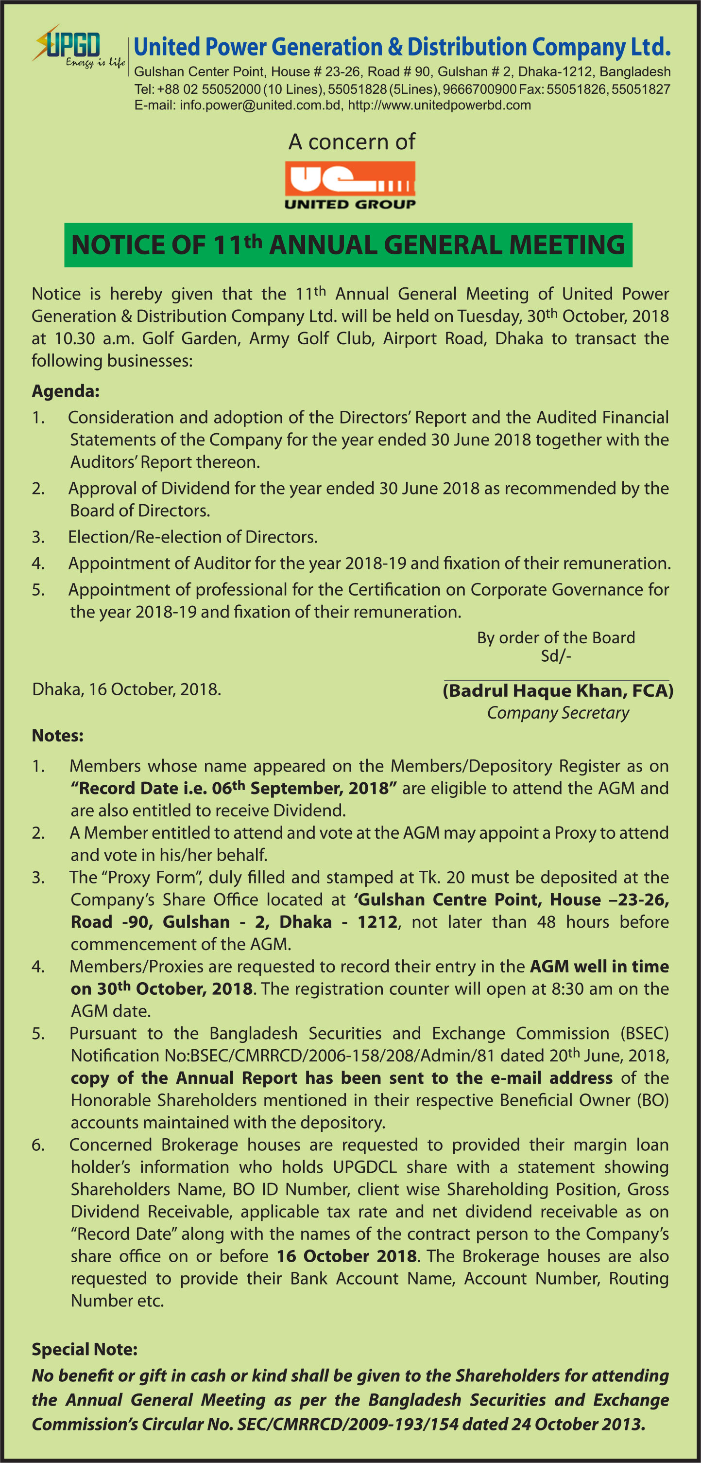 Notice 11th AGM of of United Power Generation & Distribution Company Ltd