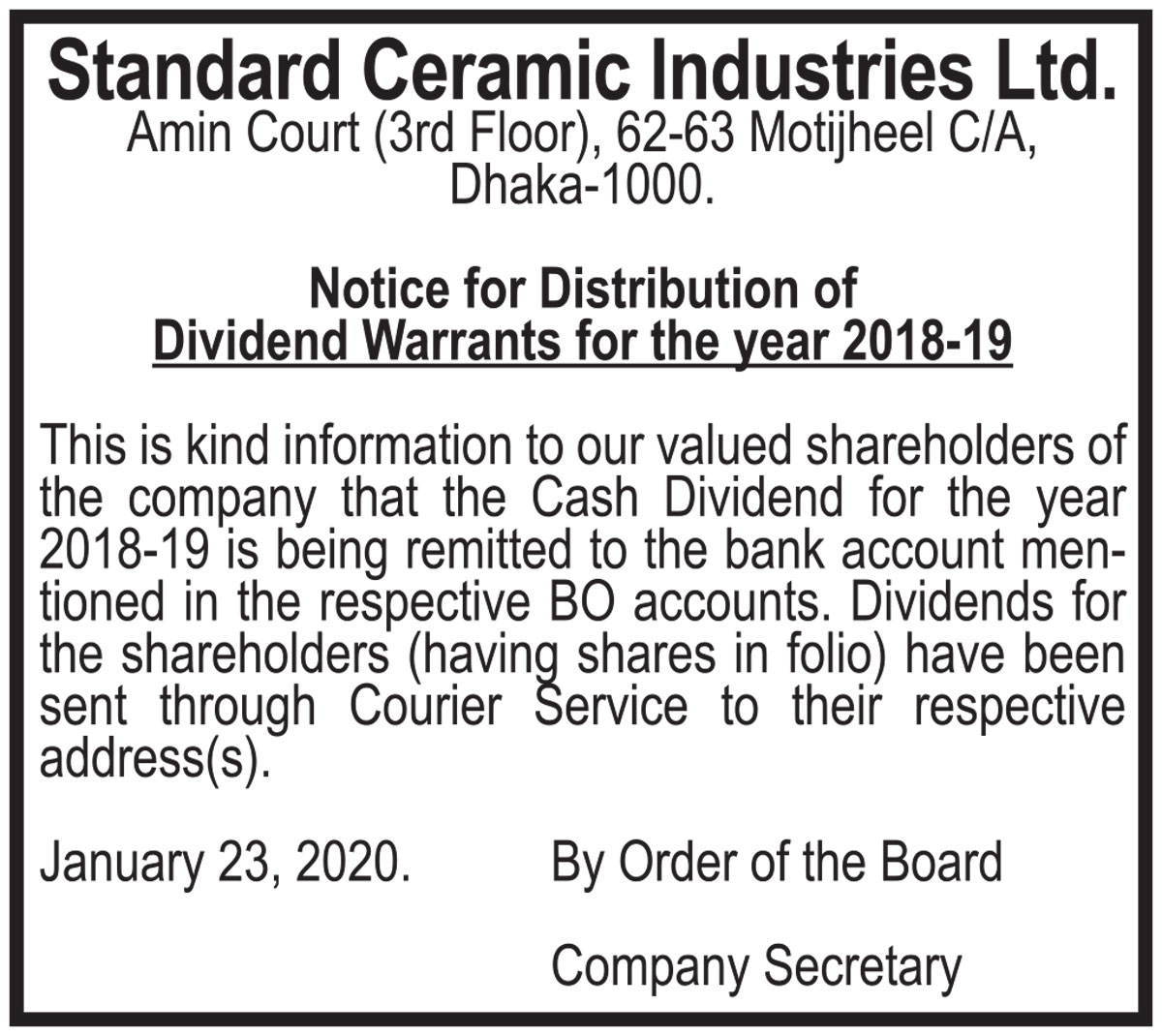 Notice for Distribution of Dividend Warrant 2018-19 for the Shareholders of Standard Ceramic Industries Ltd.
