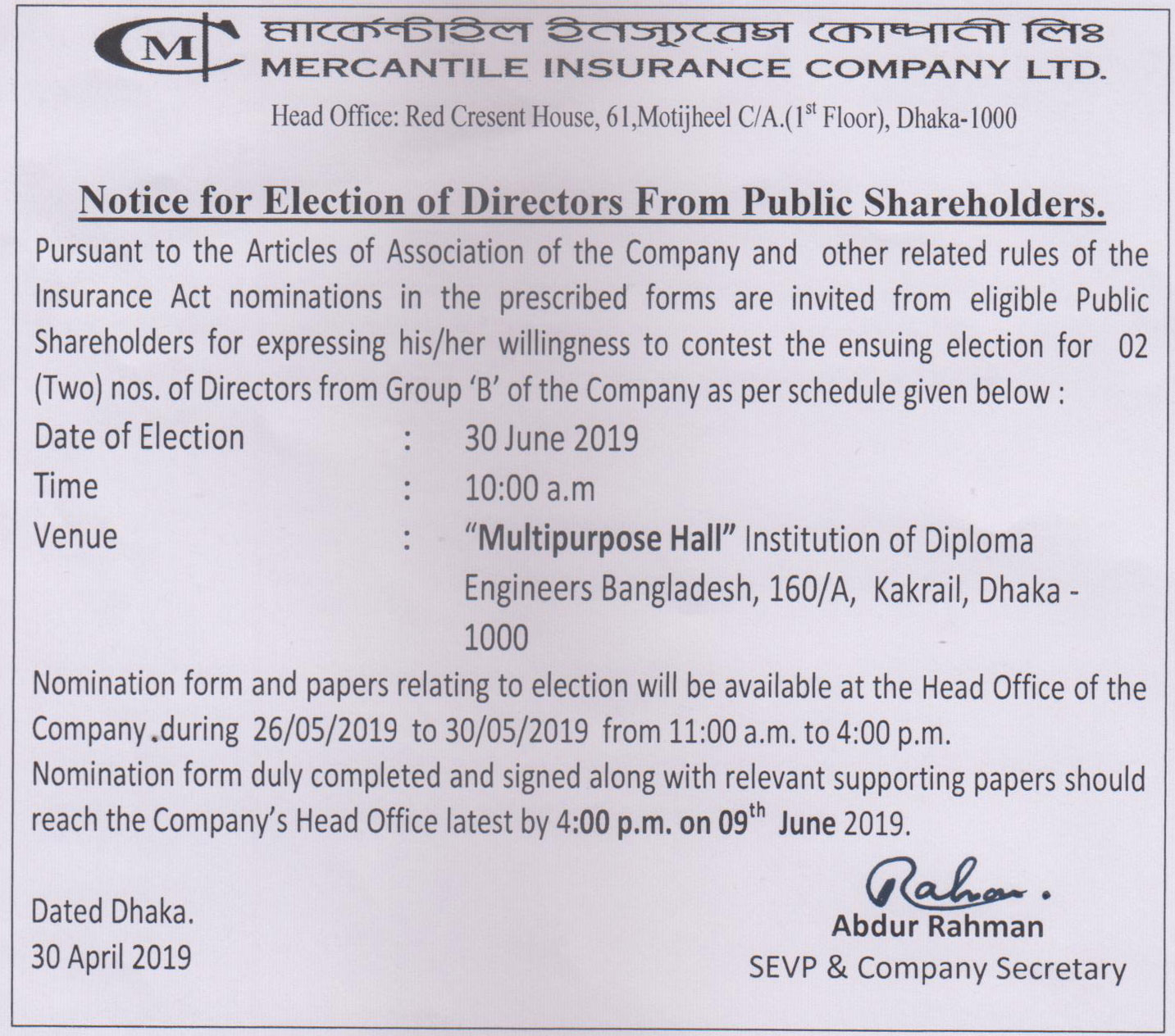 Notice for Election of Directors from Public Shareholders of Mercantile Insurance Co. Ltd