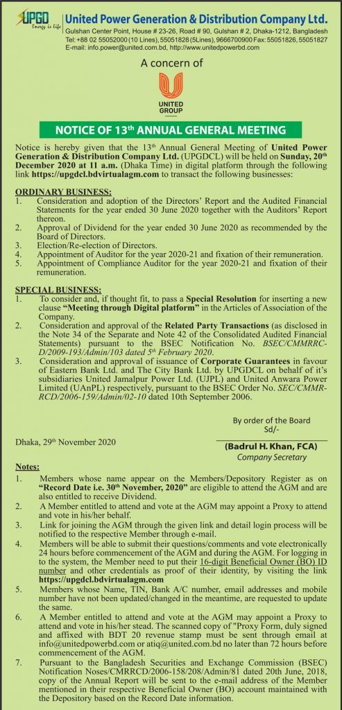 Notice Of 13th Annual General Meeting OF United Power Generation & Distribution Company Ltd