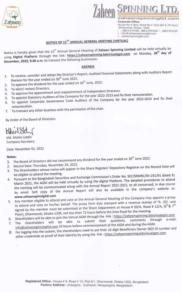 Notice of the 17th AGM of Zaheen Spinning Limited