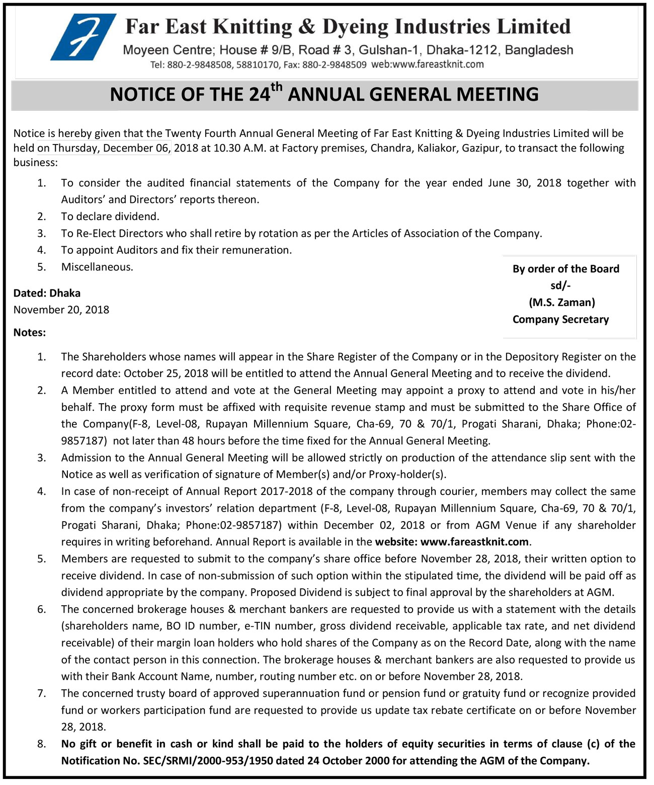 Notice of 24th AGM of Far East Knitting & Dyeing Industries Limited
