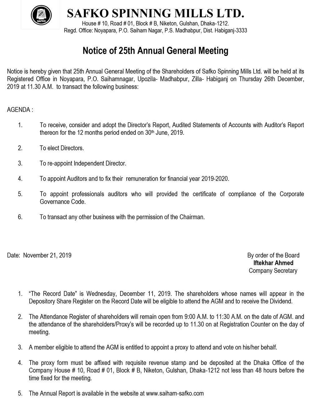 Notice of 25th AGM Safko Spinnings Mills Ltd.