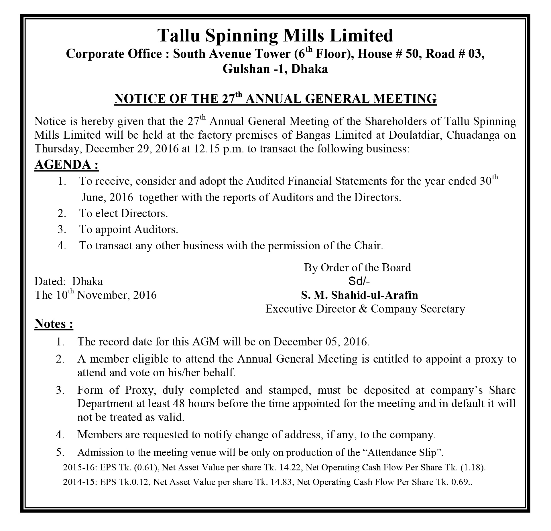 Notice of 27th annual general meeting Of Tallu Spinning Mills Limited