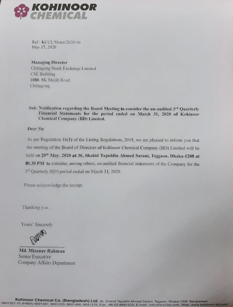 Price Sensitive Information (Q1) of Kohinoor Chemical Company (Bangladesh) Ltd.