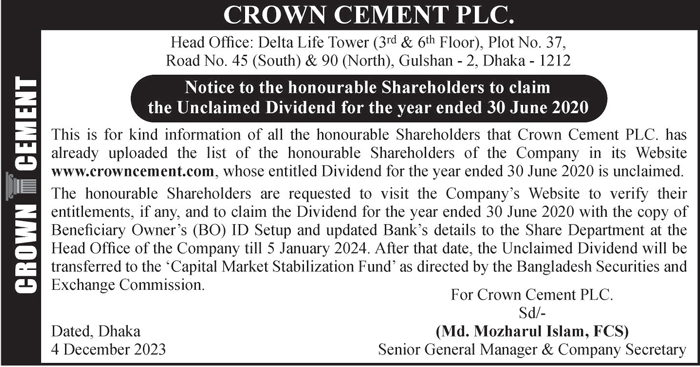 Notic to the Shareholders to claim the Uclaimed Dividend of Crown Cement PLC