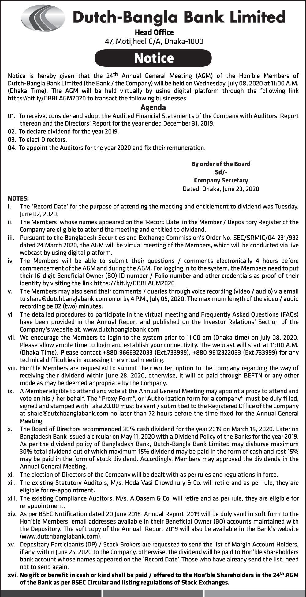 Postponement of 24th AGM of Dutch-Bangla Bank Ltd.