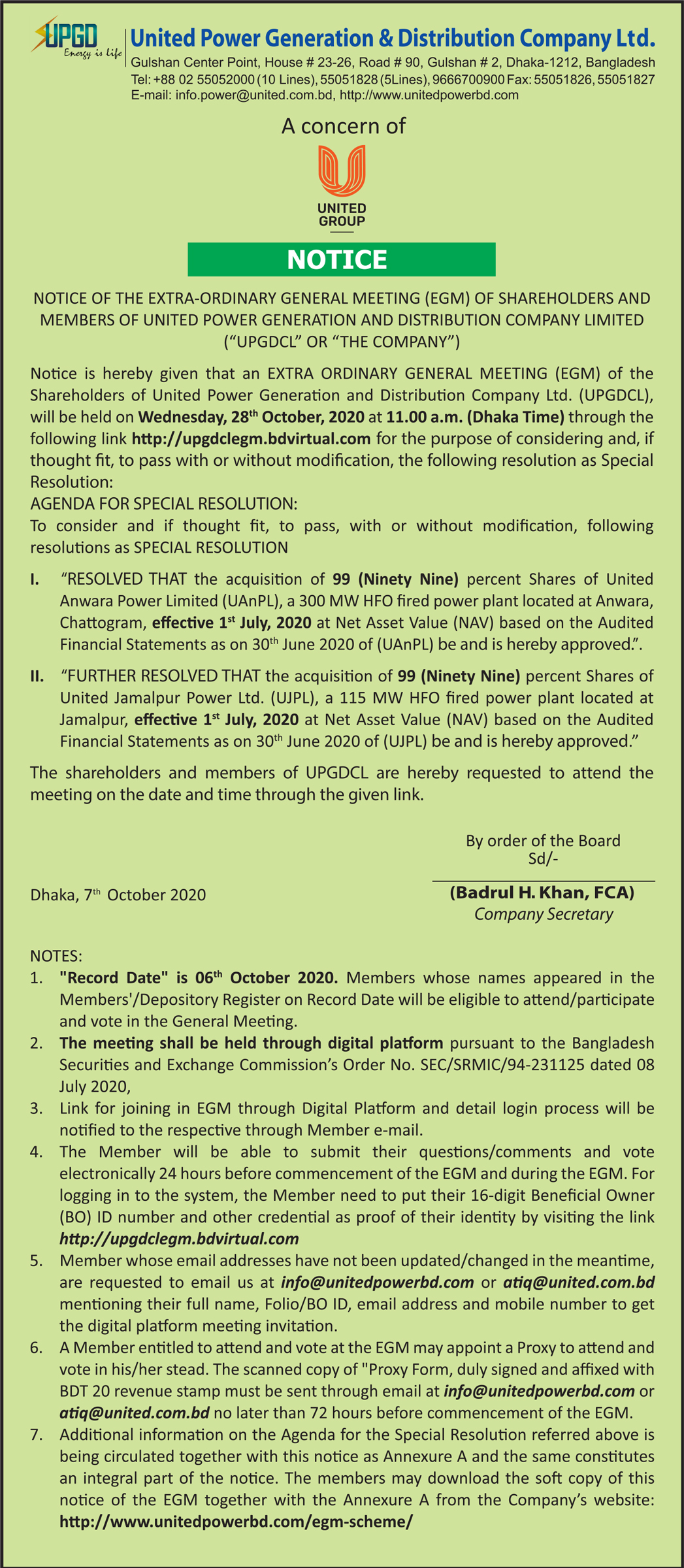 Notice of EGM of United Power Generation & Distribution Company Ltd
