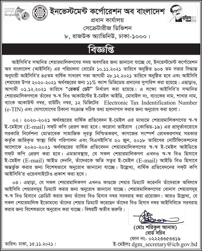 Notice of Investment Corporation of Bangladesh (ICB)