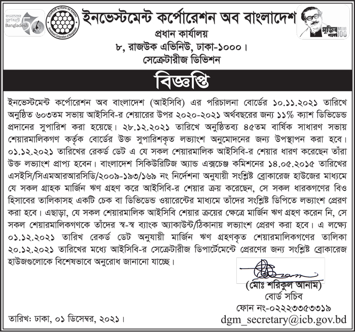 Notice of the 48th AGM of Investment Corporation of Bangladesh (ICB)