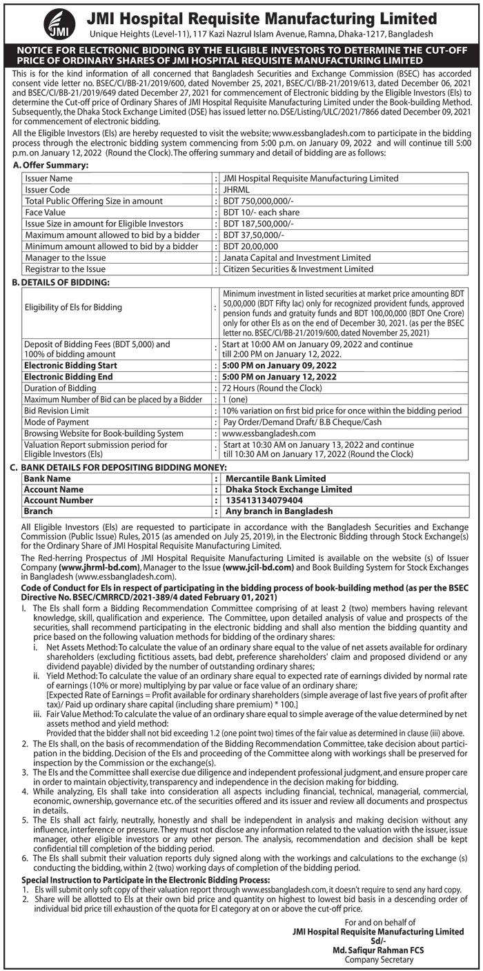 Notice of JMI Hospital Requisite Manufacturing Ltd.