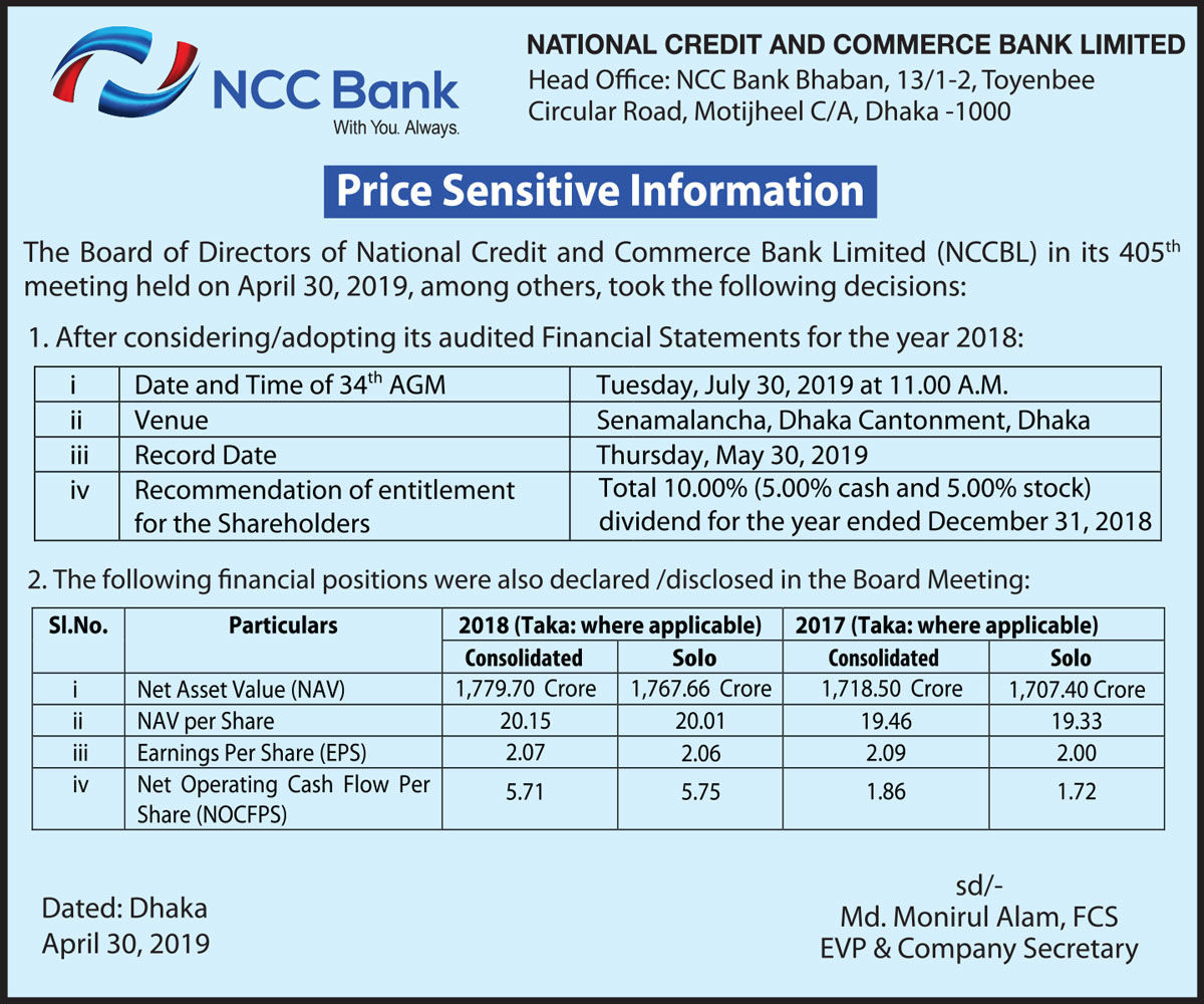 Price Sensitive Information Of NATIONAL CREDIT AND COMMERCE BANK LTD.