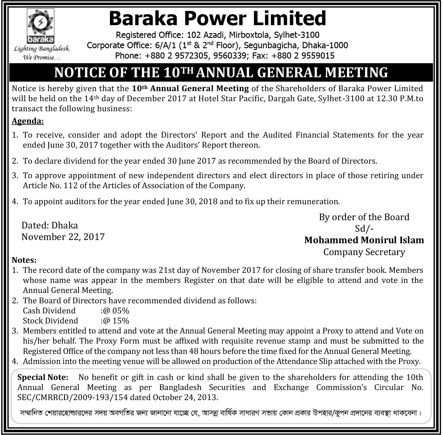 Notice of the 10th Annual General Meeting of Baraka Power Limited