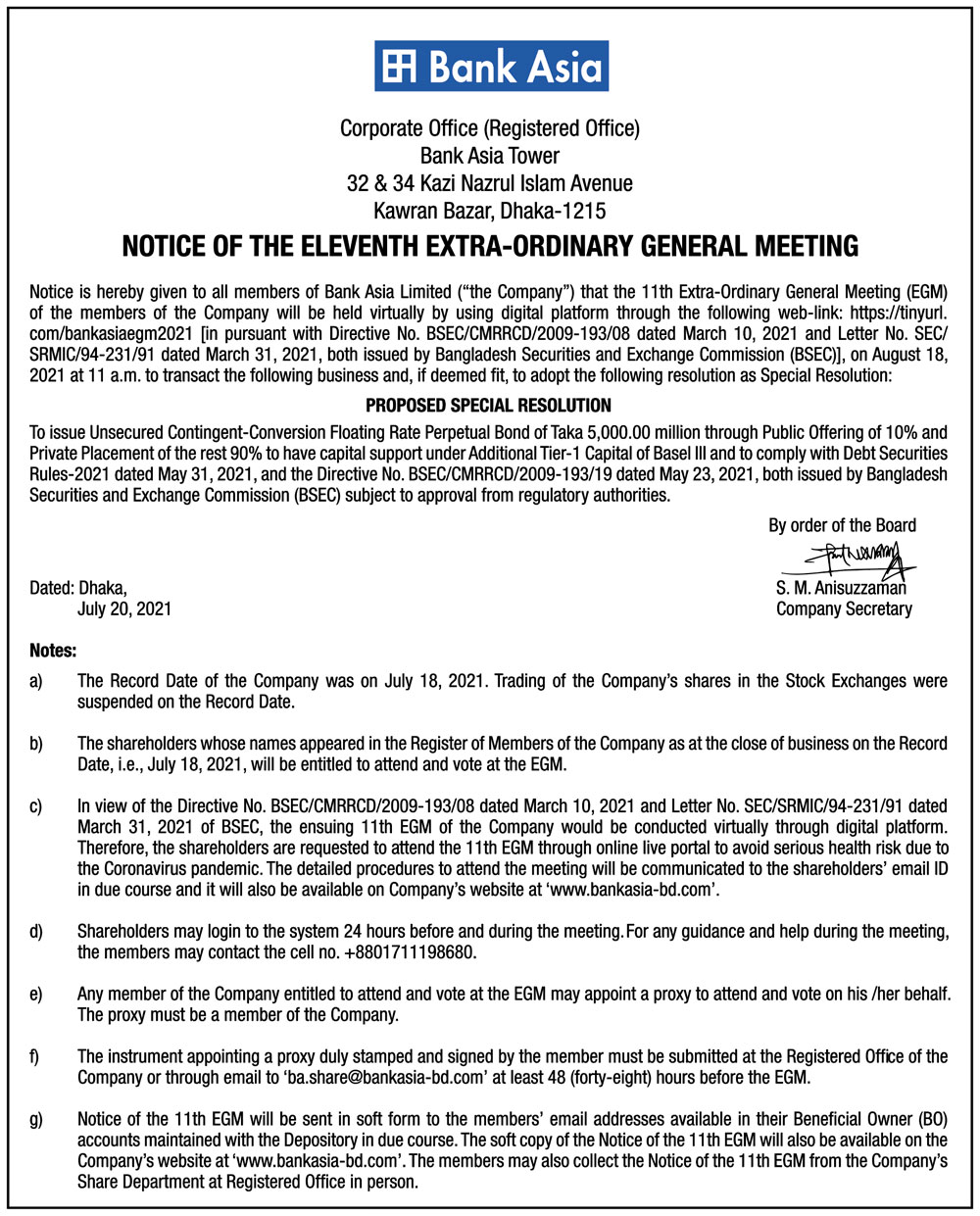 Notice of the 11th EGM of Bank Asia Ltd.