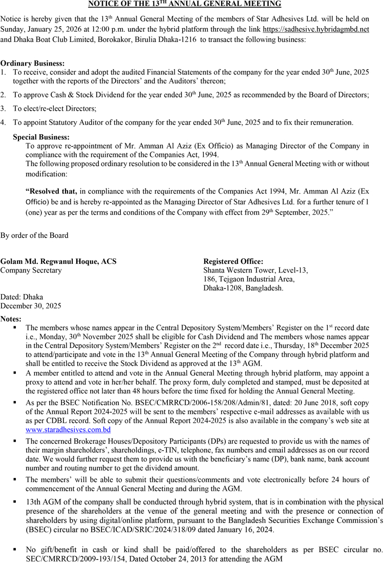 Notice of the 13th AGM of Star Adhesives Ltd.