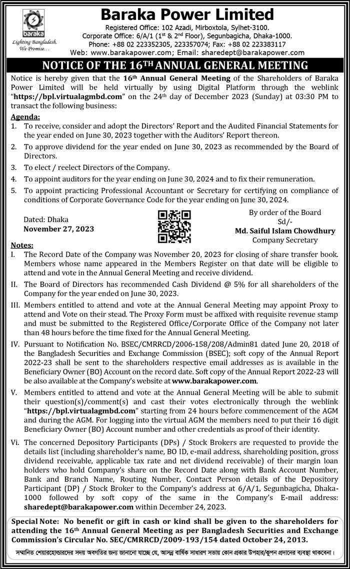 Notice for change of Date & Venue of 11th AGM of Baraka Power Limited
