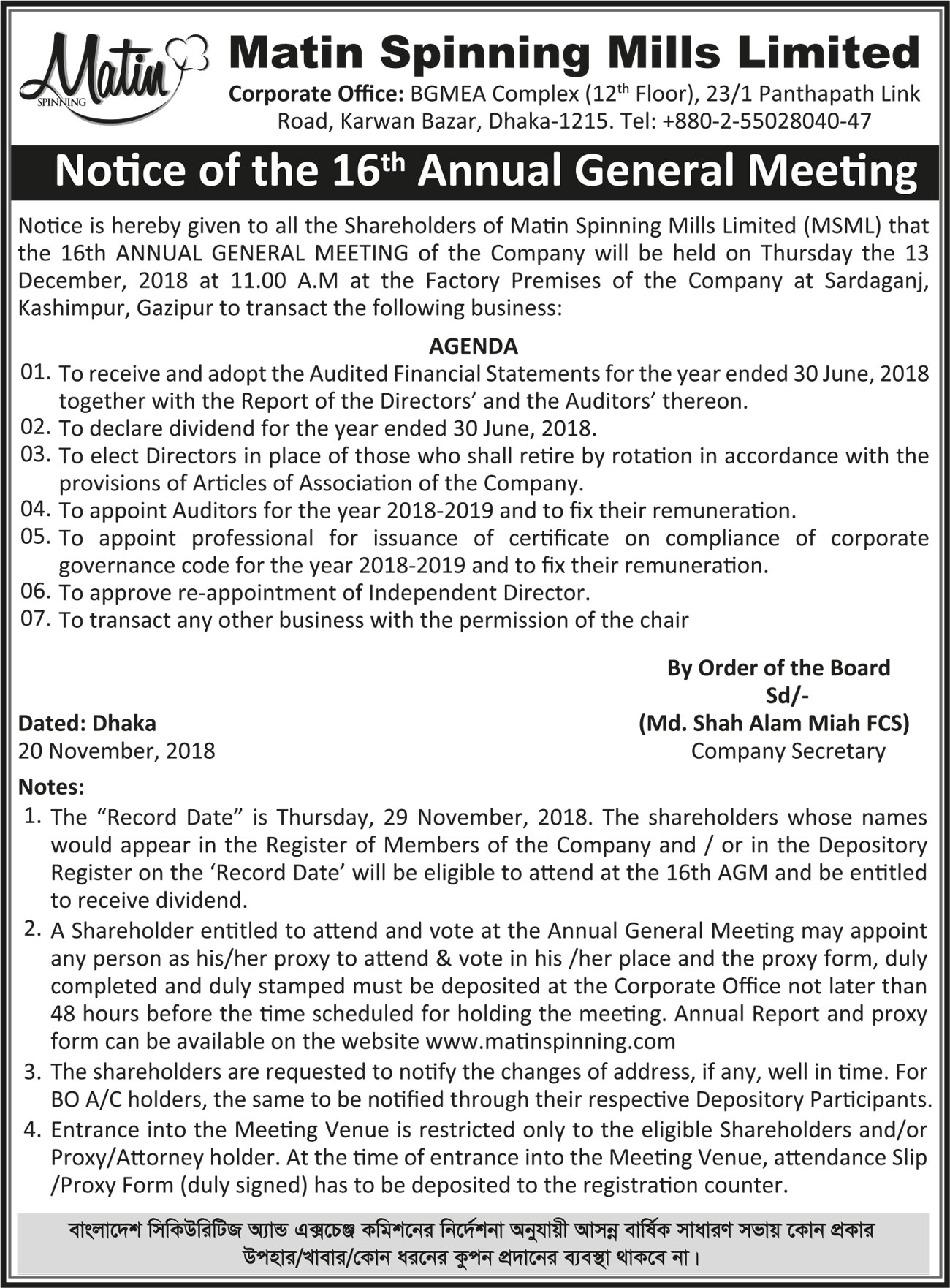 Notice of the 16th AGM of Matin Spinning Mills Ltd