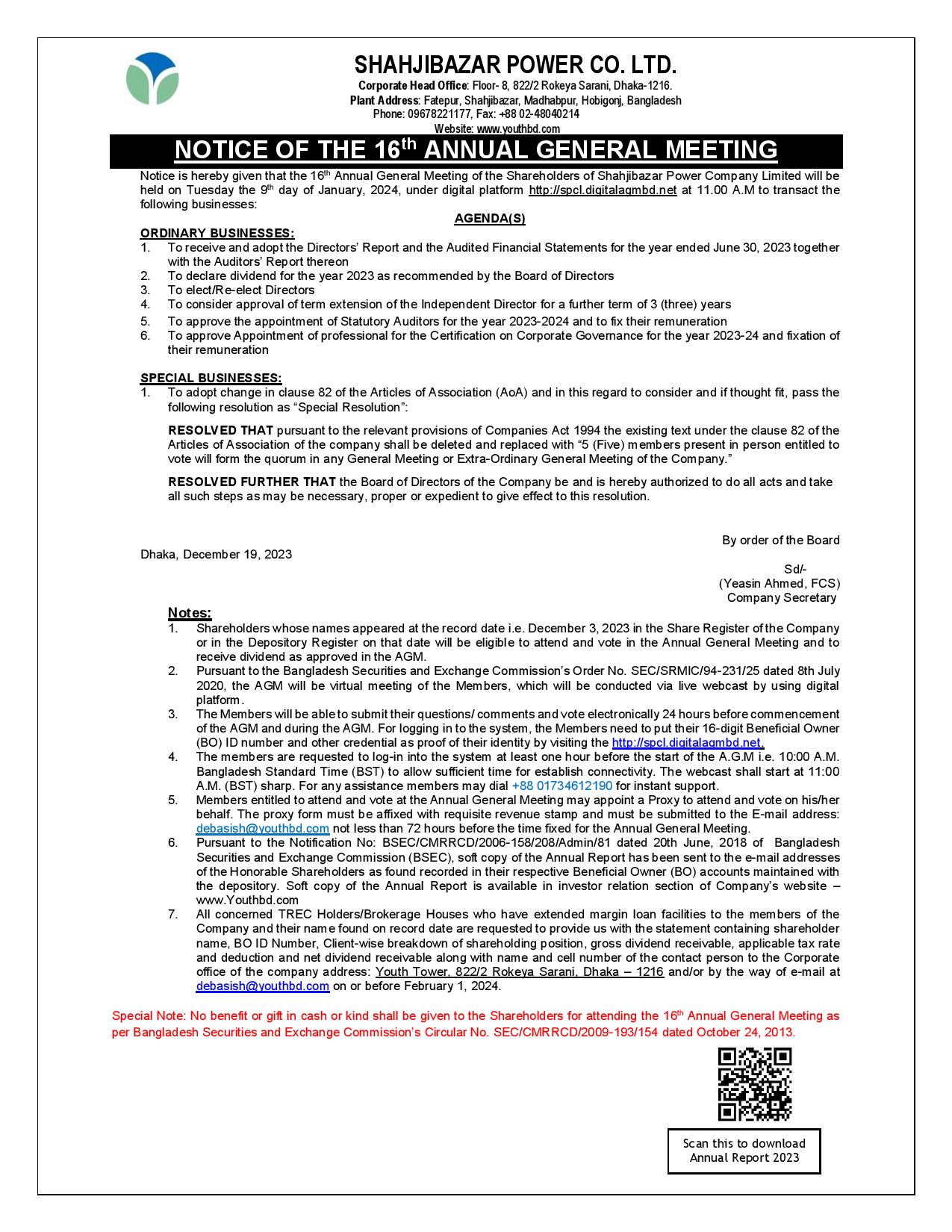 Notice of the 16th AGM of Shahjibazar Power Co. Ltd