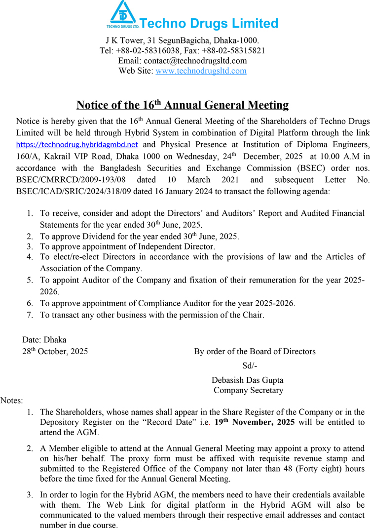 Notice of the 16th AGM of Techno Drugs Limited