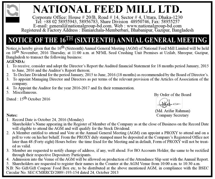 Notice Of The 16th Annual General Meeting of National Feed Mill Ltd.
