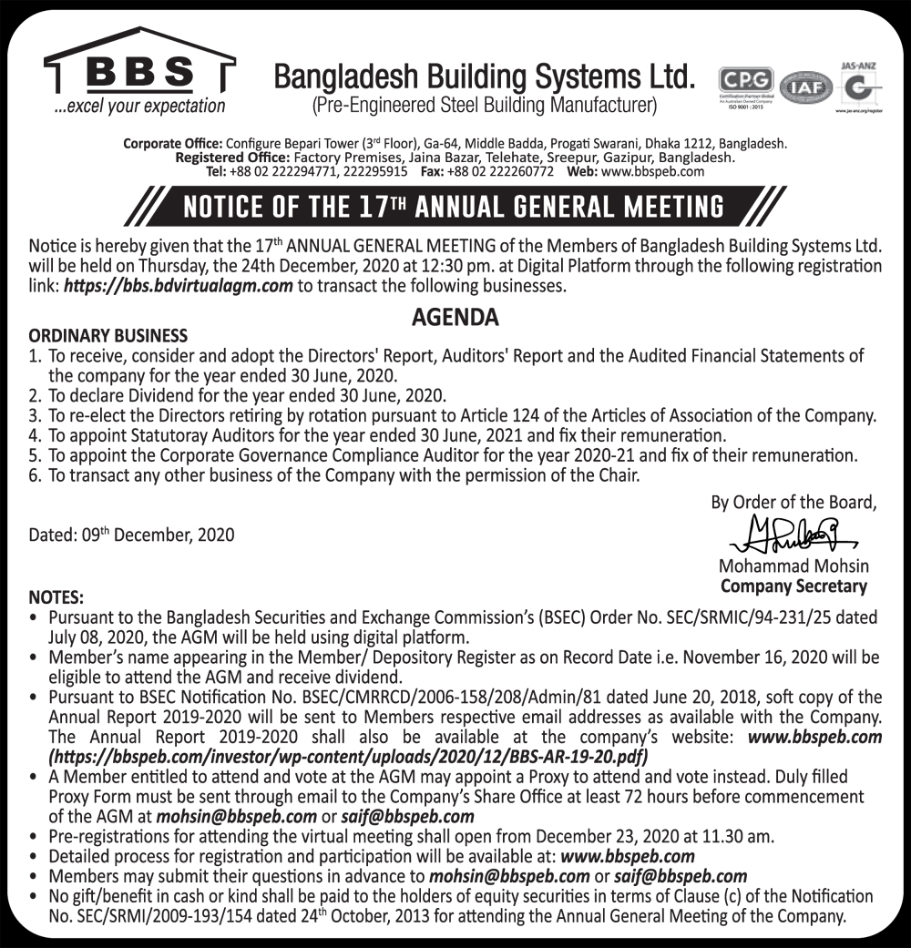 Notice of the 20th AGM of Bangladesh Building Systems Ltd.