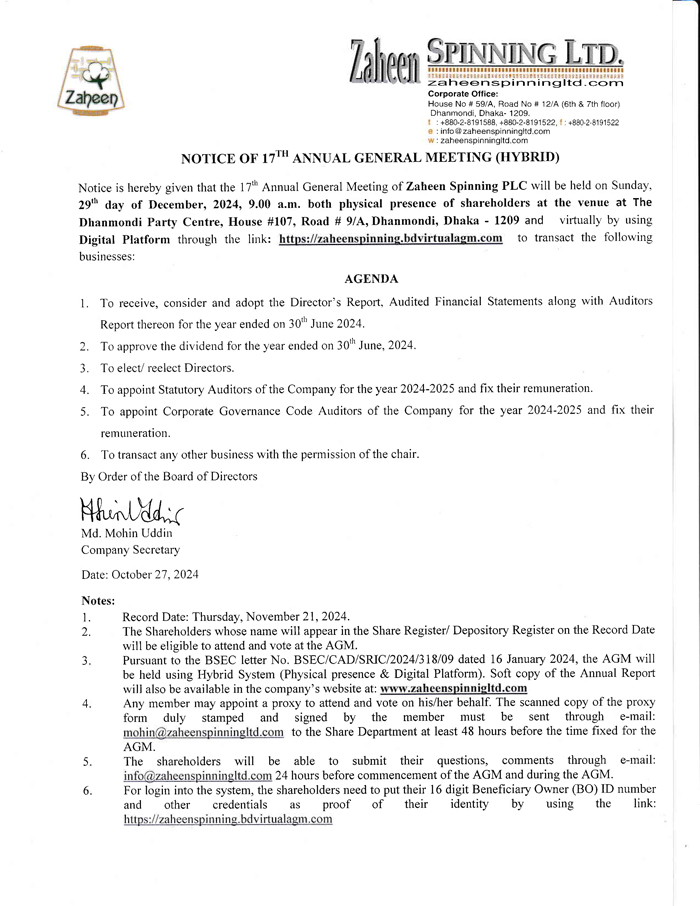 Notice of the 17th AGM of Zaheen Spinning Limited