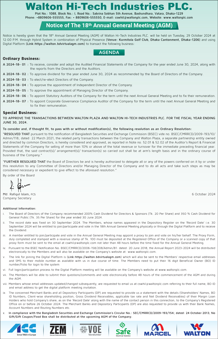 Notification for General Shareholders of Walton Hi-Tech Industries PLC.