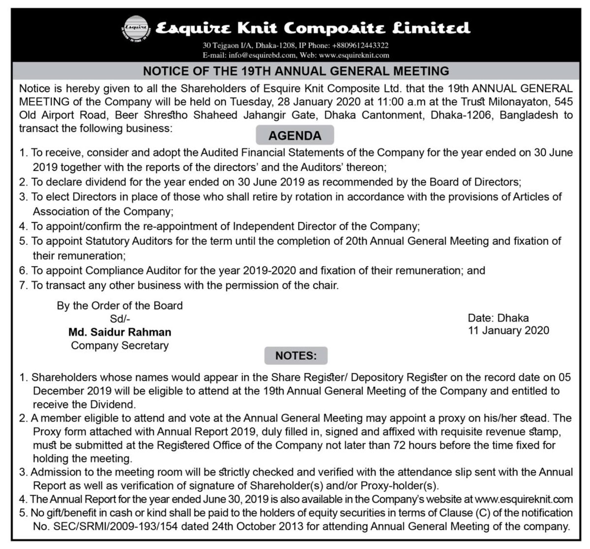 Notice Of The 19th AGM Of Esquire Knit Composite Ltd.