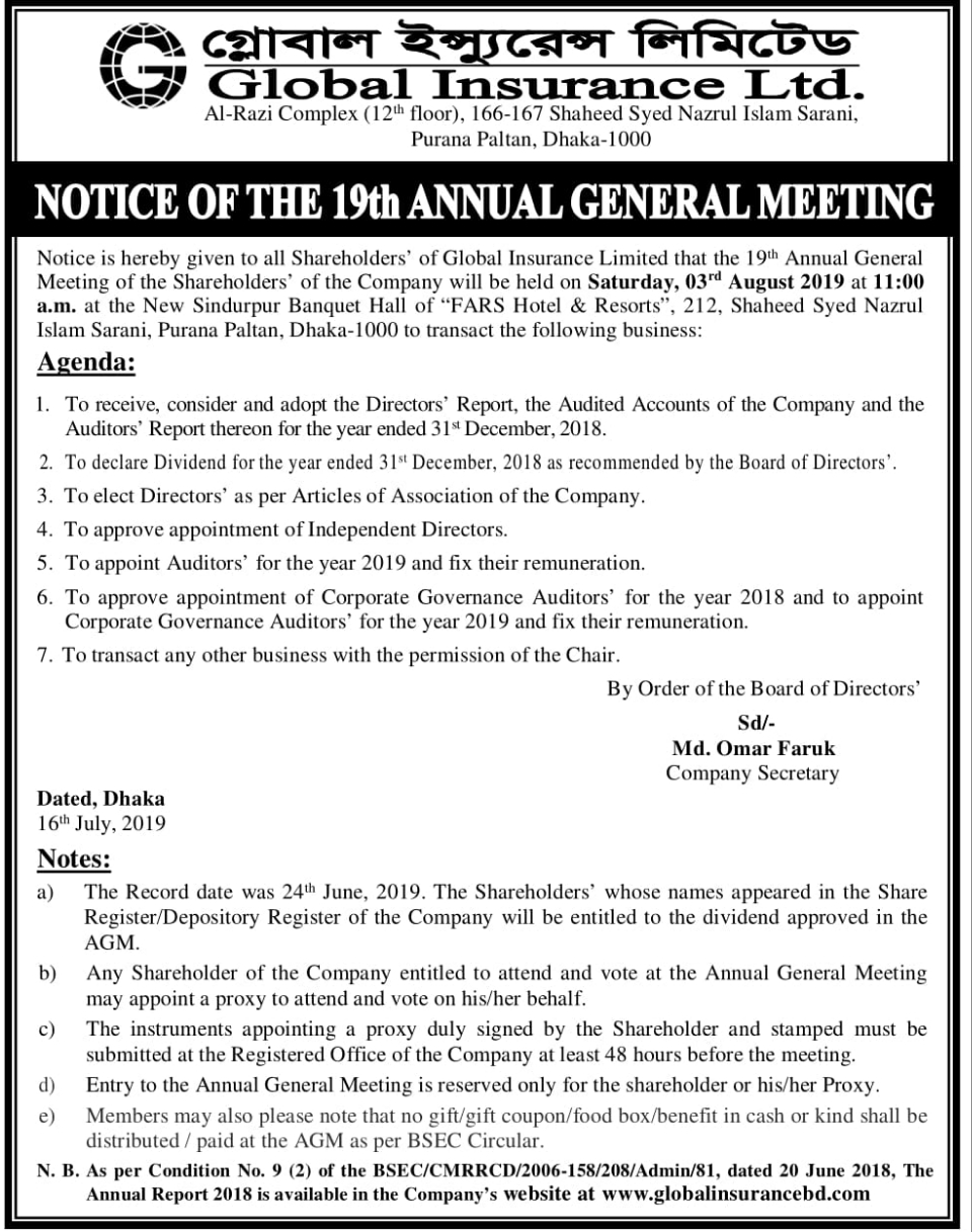 Notice of the 19th Annual General Meeting of Global Insurance Ltd.